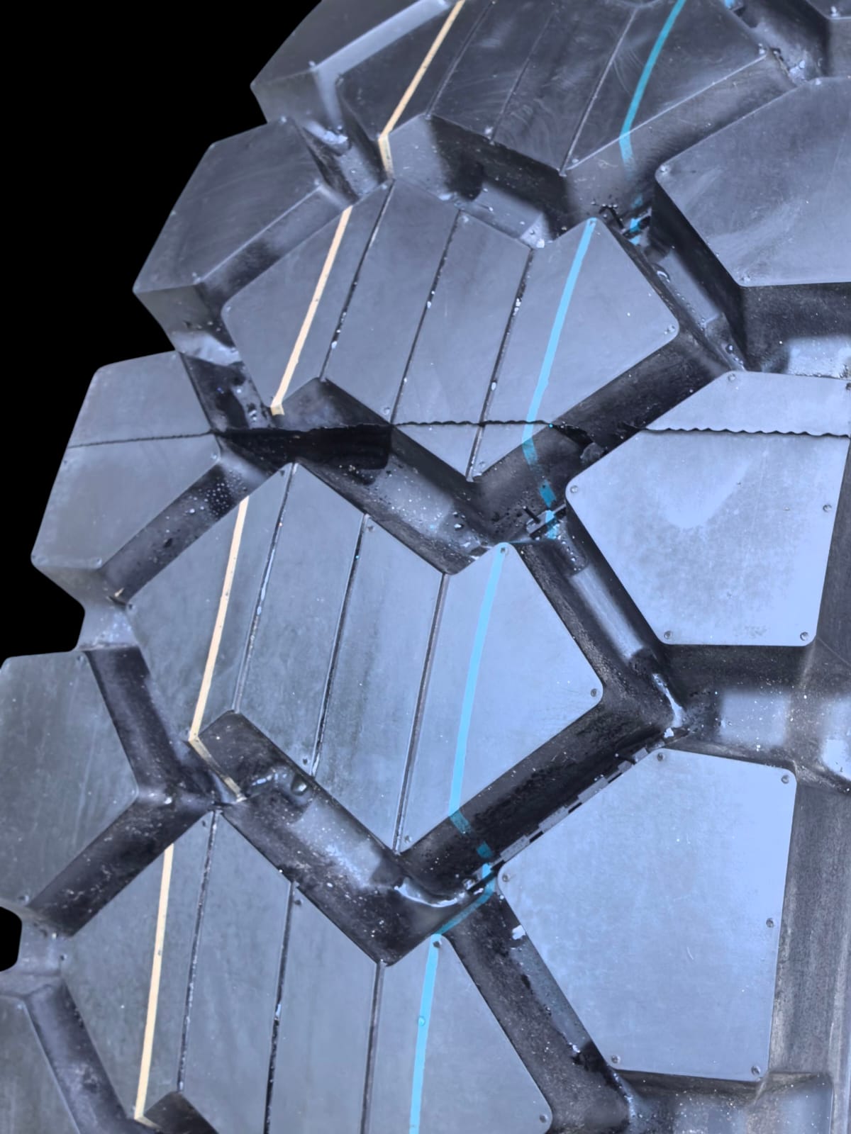 Помимо классического камне-выталкивателя, имеет систему самоочистки от камней при движении благодаря v-образному сужению блоков протектора к основанию.
